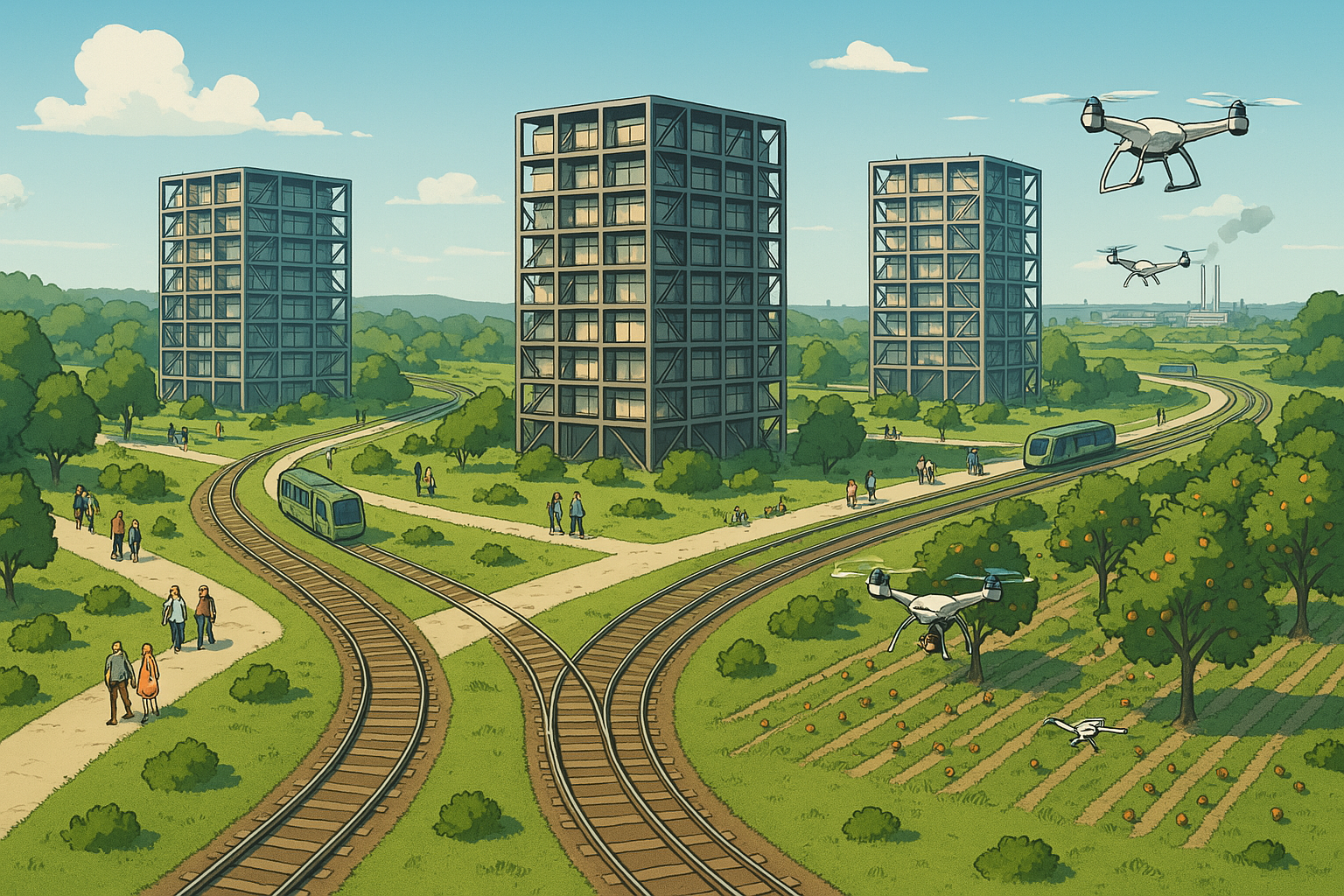 A városok körül agrár- és ipari termelői egységek működnek, valamint egy vasúti körgyűrű öleli körbe a településeket. Minden erősen automatizált: önvezető kombájnok, drónok szedik a gyümölcsöt, metszik a szőlőt. A városok között hatalmas erdők terülnek el, amelyeket csupán a városok közötti vasúthálózat tagol. Minden vasváros nagyjából önellátó, de léteznek helyi specifikus termékek is, amelyeket csere céljából termelnek.